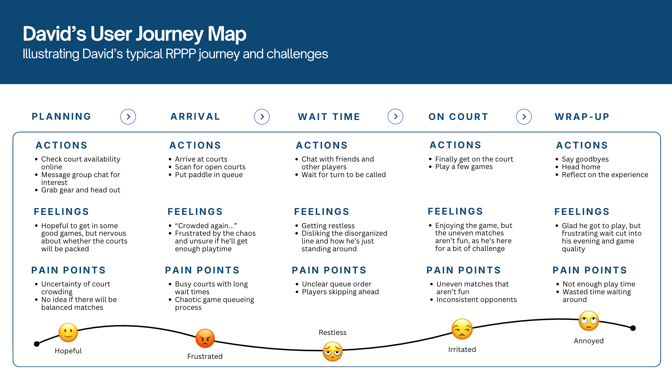 My team and I created a user journey map to visualize the end-to-end experience, identify pain points, and opportunities for an Recreational Pickup Pickleball Player (RPPP).