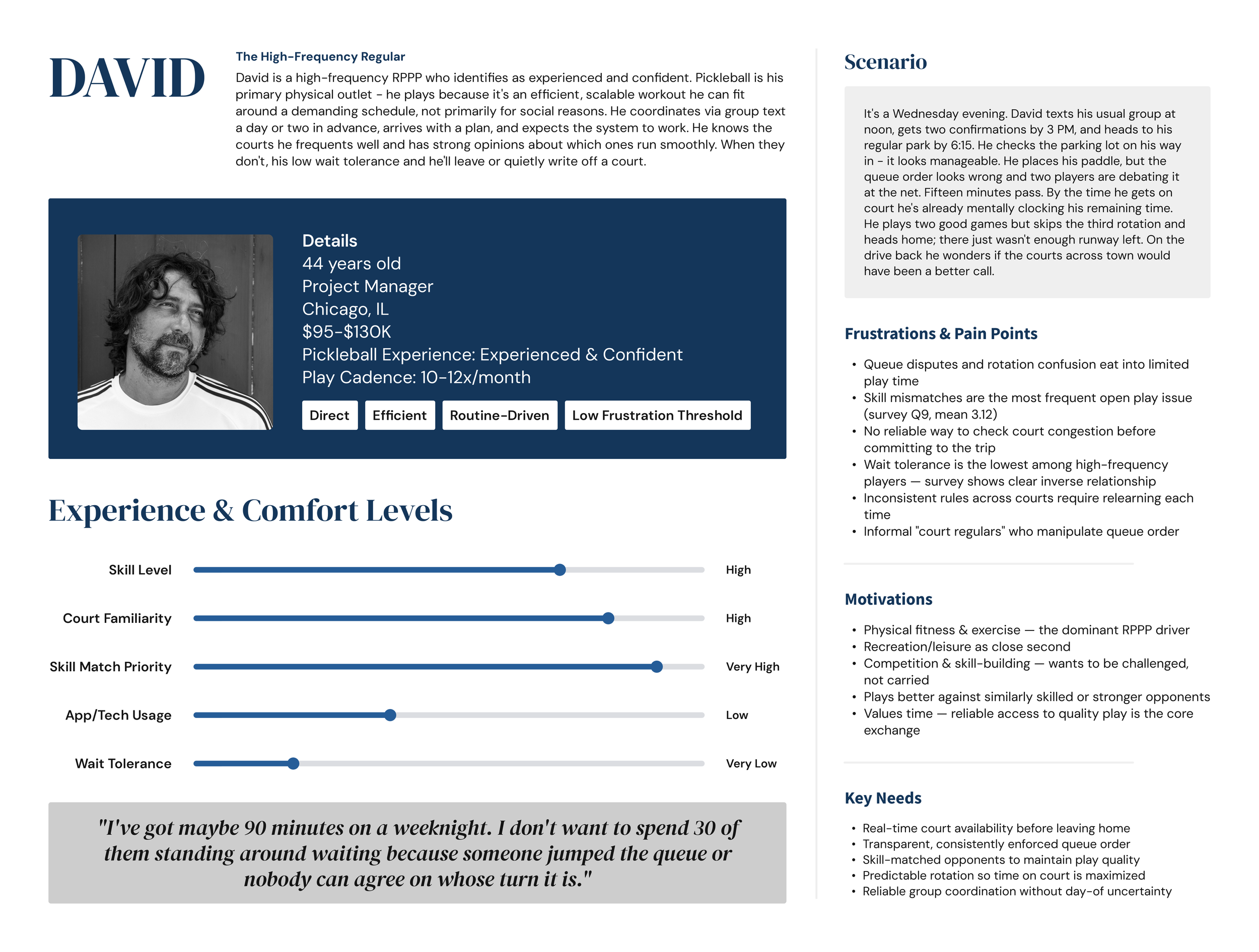 My team and I conducted 11 qualitative user interviews with Recreational Pickup Pickleball Players (RPPPs) to gain deeper insight into the motivations, behaviors, and pain points.